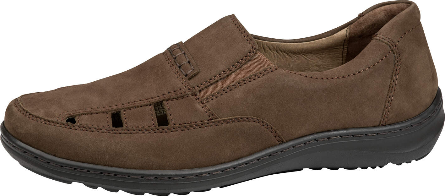 - Klassische Slipper ohne Schnürung, oft aus Leder oder Wildleder gefertigt.